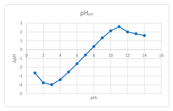 Point of zero charge pH represents the value of pH for specific conditions of temperature, pressure and solution composition, at which the value of the surface charge is zero [63,64]. Zero value of the surface charge means that an equal number of positive and negative charges are found on the surface [65]. Point of zero charge for prepared material has been determined by using the salt addition method, when identical quantities of material were added to a set of electrolyte solutions having the same ionic strength at different pH values [65].