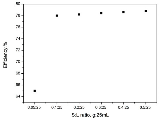 The obtained experimental data are presented in Figure 7. From the analyses of data presented in Figure 7, it was observed, as was expected, that the adsorption efficiency over SiO2FexOy increases with the increase of the S:L ratio. Based on that, it can be said that the adsorption efficiency increases with the increase of S:L ratio, up to a ratio of 0.1 g:25 mL. Any further increase of the ratio S:L leads to at no significant increase of the adsorption efficiency. Based on this observation, any further studies were carried out at a S:L ratio of 0.1:25.