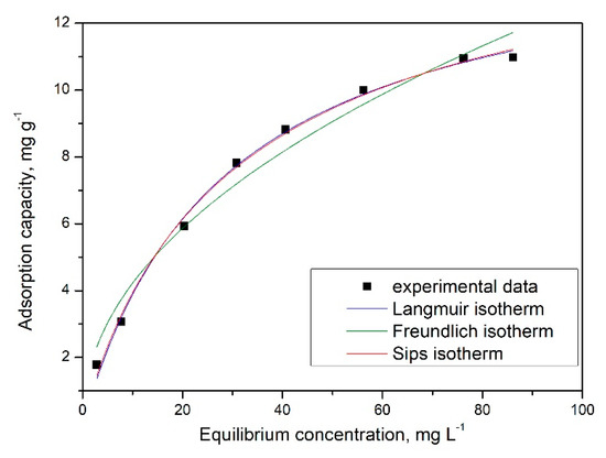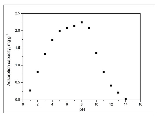 By analysing data presented in Figure 6, it is evident that the increase of the solution pH between 1 and 5 leads to an increase of the maximum adsorption capacity. When the pH increase from 6 to 8, the maximum adsorption capacity remains relatively constant, being between 2.08 and 2.24 mg g−1. Any further increase of the pH is equivalent to a decrease of the maximum adsorption capacity. Based on obtained data, any further studies were carried out into the pH interval 6 to 8.