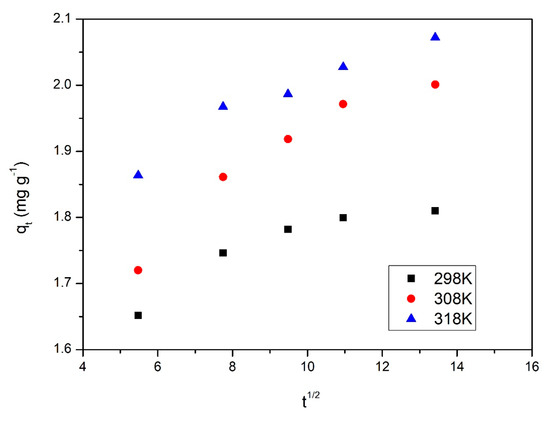 From data presented in Table 3, it can be concluded that the studied adsorption process is well-described by pseudo-second-order kinetic model. This conclusion was formulated taking in account the values of the regression coefficient, which are closer to one. The obtained conclusion is also supported by the calculated values of adsorption capacities, which have close values to the experimental obtained one. From the obtained kinetic parameters, it can conclude that the temperature does not have a significant influence, so any further experiments were carried out at 298 K. In addition to the pseudo-first-order and pseudo-second-order kinetic models, the intraparticle diffusion has been studied.