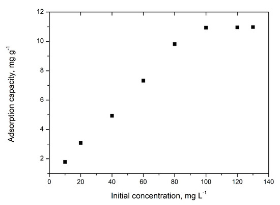 The effect of initial concentration of ions over maximum adsorption capacity were prepared solutions with initial concentrations of 10, 20, 40, 60, 80, 100, 120, and 130 mg·L−1. All adsorptions were carried out into the pH interval between 5 and 9, at 298 K for a mixing time of 90 min.