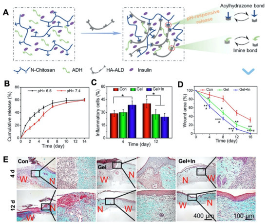 - Li, Z.; Zhao, Y.; Liu, H.; Ren, M.; Wang, Z.; Wang, X.; Liu, H.; Feng, Y.; Lin, Q.; Wang, C. pH-responsive hydrogel loaded with insulin as a bioactive dressing for enhancing diabetic wound healing. Mater. Des. 2021, 210, 110104. [Google Scholar] [CrossRef]