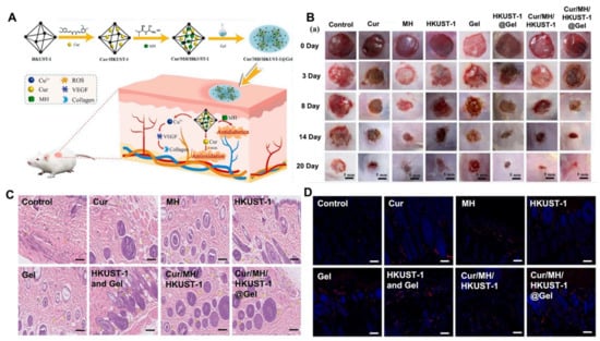 - Yang, L.; Liang, F.; Zhang, X.; Jiang, Y.; Duan, F.; Li, L.; Ren, F. Remodeling microenvironment based on MOFs-Hydrogel hybrid system for improving diabetic wound healing. Chem. Eng. J. 2022, 427, 131506. [Google Scholar] [CrossRef]