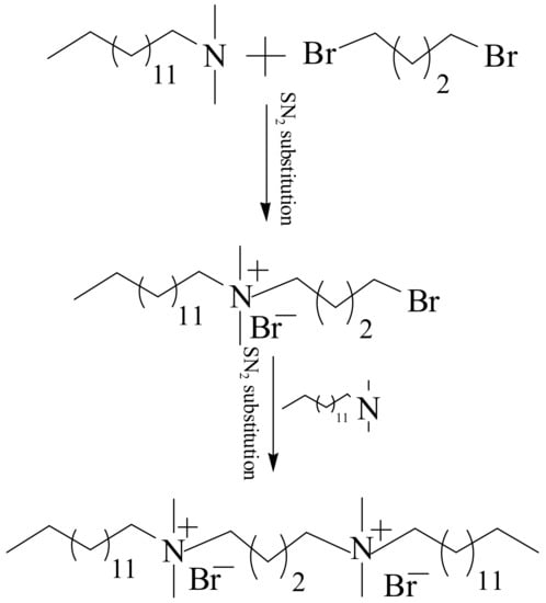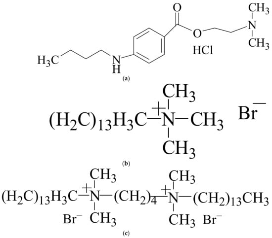 The anesthetic amphiphilic drug, tetracaine hydrochloride (TCH) was the product of Molecules On (Basel, Switzerland) and used as received. Tetradecyl trimethyl ammonium bromide (TTAB) was procured from Merck (Kenilworth, NJ, USA). N,N-dimethyl tetradecyl amine (Sigma-Aldrich, St. Louis, MO, USA), 1,4-dibrobutane (Sigma-Aldrich), absolute ethanol (Sigma-Aldrich), ethyl acetate (Sigma-Aldrich) were purchased for gemini synthesis. The synthesis of gemini surfactant was followed by the earlier procedure [33,34] and protocols are presented in Scheme 2.