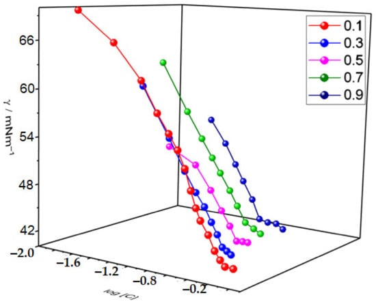 Surface tension (γ) vs. log molar concentration (C) of 2G4 + TCH mixed systems (gemini surfactant (2G4); tetracaine hydrochloride (TCH)).