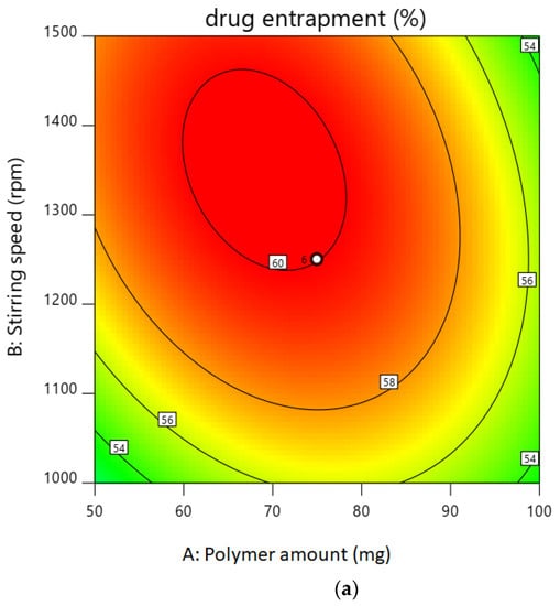 The entrapment efficiency for all the batches was calculated, and the wide variation was observed, i.e., the values ranged from 47 to 60%. Hence, the obtained results indicate that the entrapment efficiency value was strongly affected by the variables used in this study. It can be found that A, B, (A2), and (C2) are the significant model, as the p values of the above independent variable are less than 0.05. Here, the coefficient of independent variable B, (A2), and (C2) has the negative value. An increase in stirring speed or average stirring speed and probe sonication time increases the entrapment efficiency as it increases the viscosity, which leads to a decrease in the particle size of the nanoparticles. As the viscosity of the external aqueous phase decreases, effective diffusion of the organic phase is hindered, leading to smaller droplet formed, which affects the mean size of the particle, and hence, the entrapment efficiency is high. This result is also confirmed by the contour plot for the entrapment efficiency in Figure 1a,b. The desirability of optimized batch is shown in Figure 1c overlay plot.