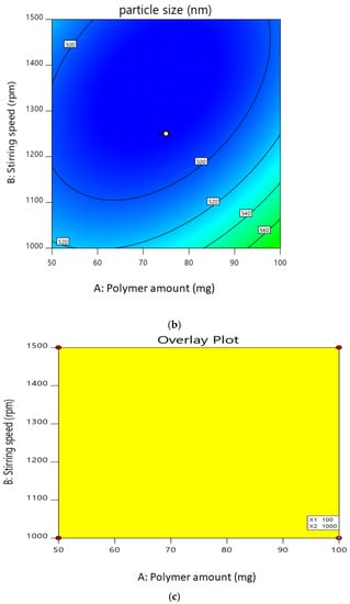 (a). Contour plot of drug entrapment. (b). Contour plot of particle size. (c). Overlay plot for confirmation.