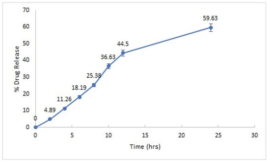 The optimized PS-CS-NG formulation was subjected for in vitro drug release behavior. It was performed by the dialysis bag method, and the optimized formulation (N20) showed the highest drug release (59.63%) in 24 h (Figure 4). This showed the uniform distribution of drug in the formulation.