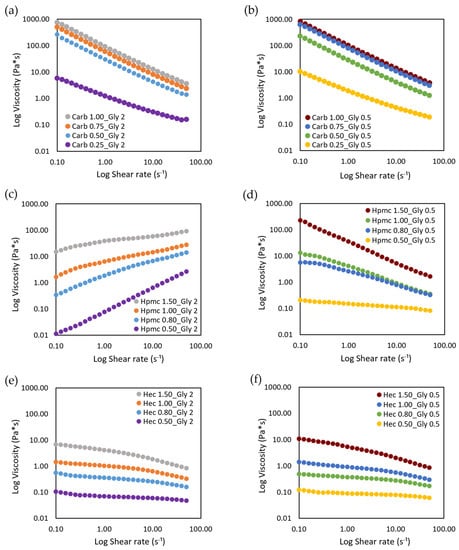 Viscosity vs. shear-rate curves of alcohol-based gel sanitizers. The curve is the average of three measures. (a,b) Carbopol-based gels; (c,d) HPMC-based gels; (e,f) HEC-based gels.