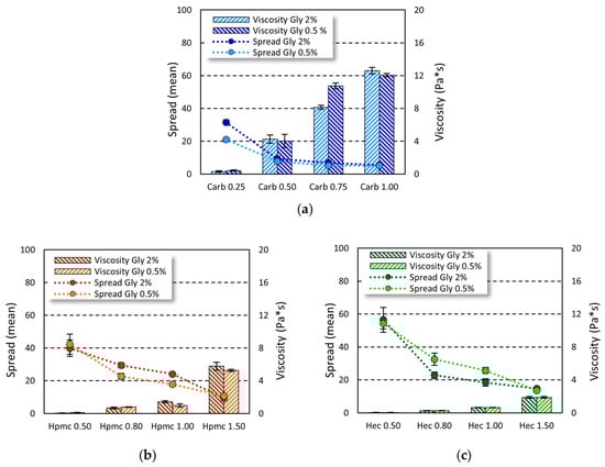 Viscosity and spreadability of alcohol-based hand sanitizers. (a) Carbopol-based ABHS; (b) HPMC-based ABHS; and (c) HEC-based ABHS.