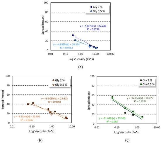 Relationship between viscosity and spreadability of the alcohol-based gels. Spreadability plotted against the viscosity of gel based on carbopol (a), HPMC (b), and HEC (c).