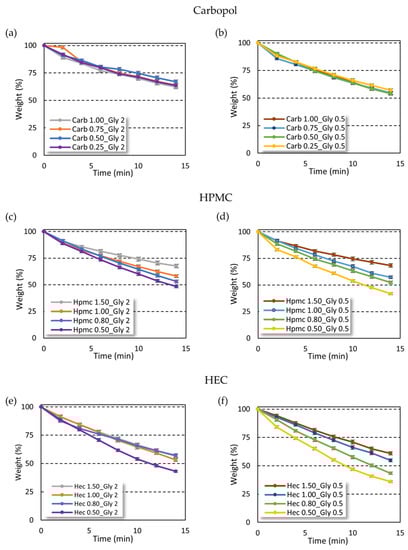 The hydro-alcoholic solvent evaporation rate from gels. The results are reported as weight of gel percentage in the time. (a,b) Carbopol-based gels; (c,d) HPMC-based gels; (e,f) HEC-based gels.