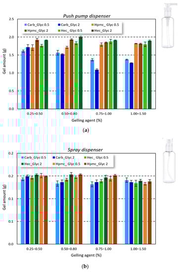 Considering the final gel application and the influence of gel amount applied to achieve an effective antimicrobial activity, the correct delivery and reproducibility of the gel amount delivered by the commercially available bottles is crucial. As reported in Figure 5, all the studied gels can be easily delivered by both push pump and spray dispenser. The delivered amount was very close for the cellulose-based gels (1.816 ± 0.083 g for HPMC-based gels and 1.872 ± 0.075 g for HEC-based gels), while for carbopol-based gels a slight reduction in the delivered amount was observed (around 1.705 ± 0.097 g). Nevertheless, the delivery of all the tested formulations can be considered reproducible.