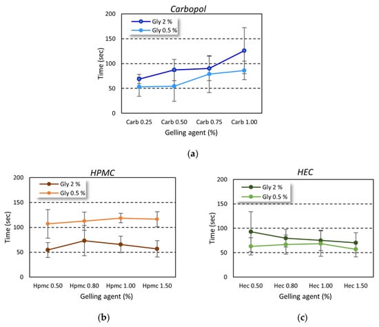 The gel dry time by rubbing. The results are reported as time needed to achieve complete drying by rubbing a known amount of gel on the hands of volunteers. (a) Carbopol-based gels; (b) HPMC-based gels; (c) HEC-based gels.