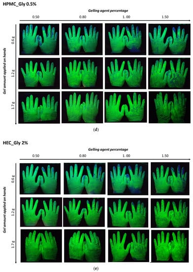 The distribution of ABHSs on hands after rubbing was also influenced by the gelling agent percentage employed. In particular, the increase of the gelling agent percentage, which increases the viscosity and reduces the spreadability, led to a reduction in homogeneous gel distribution (Figure 7). Nevertheless, the effect of gel viscosity and spreadability was decreased by increasing the applied amount of ABHS. In this case, the hand surface was completely covered for all the tested formulations.