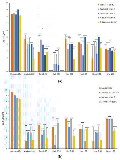 All the formulations tested significantly reduced the viability of each selected strain. As shown in Figure 8, the Carb0.5 formulation drastically reduced the viability of all Gram-negative strains tested with a reduction ≥ 7 Log CFU, while the other gels resulted in 5–6 Log CFU reduction (HPMC gels toward E. coli ATCC and E. coli ESBL strain 1, HEC gels for E. coli ESBL strain 2 and A. baumanii strain 2) (Figure 8). In the case of Gram-positive strains, the carbopol 0.5 gel dramatically reduced the viability of the S. aureus strain ATCC and E. hirae ATCC with 8 Log CFU reduction, whereas the HEC 1.0 formulation reduced the viability of S. aureus MRSA strain 2 with a decrease of 7 Log CFU and the HPMC 0.8 formulation that of S. epidermidis with a reduction of 8 Log CFU (Figure 8). Moreover, the gel formulations tested were significantly active against C. albicans, with the Carb 0.25 gel showing the highest antifungal activity (Figure S5, in the Supplementary Materials). The antimicrobial activity of an ethanol: water solution at 66% w/w (corresponding to 73% v/v) was tested as the control and no microorganism viability was observed in any tested strain (data not shown).