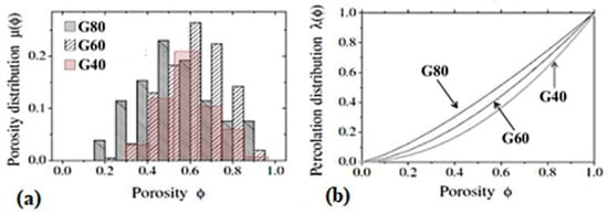 Specifically, as reported in the Materials and Methods section, the samples were identified by different specific surface area S from 16 m2/g to 188 m2/g, reflecting different local percolation probabilities λ(ϕ) and local porosity distributions μ(ϕ). S, μ(ϕ) and λ(ϕ) are used to characterize the connectivity in porous and highly heterogeneous media together with transport properties prediction [41]. Figure 2 shows the local porosity distribution μ(ϕ) and the local percolation probability λ(ϕ) of the three polymeric matrices investigated by dielectric relaxation spectroscopy measurement [42]. Among the investigated samples, the G40 sample is characterized by the largest S and the lowest percolation probability.