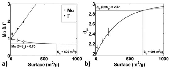 fitted to the data in Figure 4a with Mα∞ ≈ 2/3. The result of the fitting procedure suggests that Sc = S (Mα = 0.7) ≈ 695 m2/g. Moreover, from Figure 4b, it is possible to highlight that relation (1) can be successfully used to describe the behavior of dw = 2/Mα as a function of S.