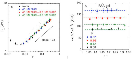 Although the swelling dependence of the shear modulus of rubbery materials is generally a non-trivial problem, especially when the network material is swollen from the dry state [39], the classical network elasticity theory usually performs quite well for hydrogel materials, including polyelectrolyte hydrogels. In Figure 1a, we show a representative plot for PAA hydrogels swollen in different salt solutions, where the shear modulus is derived from the relation, Gs ≡ σ/(Λ − Λ−2) (where Λ is the deformation ratio, see also caption of Figure 1b and section Materials and Methods). Deviations from the classical theory are only observed at small values of φ, corresponding to a large degree of network swelling where chain finite extensibility starts to become an issue. All our elasticity data for the hydrogels investigated in the present work, both charged and neutral gels, conform rather well to the classical network elasticity theory.