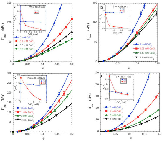 The dependence of Πmix as a function of φ is shown in Figure 2a for sodium polyacrylate (PAA) gels that have been swollen in 40 mM NaCl solutions containing different amounts of CaCl2 [33,34,35]. It can be seen that Πmix decreases with increasing concentration of divalent cations. The lines through the experimental data points are least squares fits to Equation (4). As shown in the inset, addition of divalent counter-ions causes a weak decrease in the value of A2 over the entire concentration range explored, while A3 strongly decreases as the divalent ion concentration increases and thereafter exhibits a slow decrease. Although some of these data were reported previously [33], but earlier observations were analyzed in terms of the Flory-Huggins interaction parameters χ0 and χ1 so the significance of those results in terms of the virial coefficients was not appreciated. The same situation holds for the other polyelectrolyte gels that we next consider. Figure 2b–d show similar data for DNA gels (Figure 2b [36]) and sodium poly(styrene sulfonate) gels (PSS) (Figure 2c) swollen in 40 mM NaCl solution, and for hyaluronic acid gels (HA) (Figure 2d) swollen in 100 mM NaCl solution with different CaCl2 contents. In all cases Πmix decreases with increasing Ca salt concentration. The variation of A2 and A3 with the CaCl2 concentration is similar in all four chemically different gels, indicating that all these systems exhibit an inverted variation in A2 and A3 from ‘ordinary gels’ where the onset of the deswelling transition is signaled by a change in the sign of A2 while A3 remains positive. The relative insensitivity of the observed trends to the specific chemical nature of the polyelectrolyte is also striking.