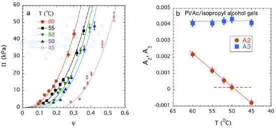 Mixing pressure Πmix versus polymer volume fraction φ plots for uncharged polyvinyl acetate (PVAc) gels [50]. The continuous lines show in (a) show fits of Equation (4) to the experimental data and the variation of A2 and A3 as a function of temperature are shown in (b). Note that A3 is small in magnitude and A2 changes sign as T varies, signaling the deswelling of the gel. The dotted line indicates A2 = 0, which defines the theta point condition [6,7]. The data uncertainties are estimated by one standard deviation of the linear regression fit parameters.