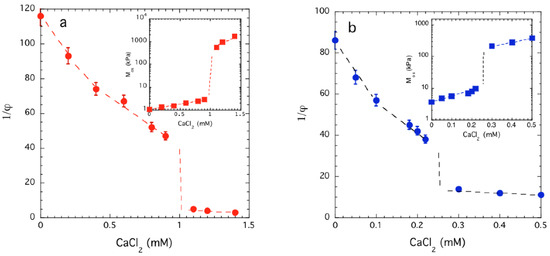 Dependence of the equilibrium swelling ratio (1/φ) of PAA (a) and DNA gel (b) in 40 mM NaCl as a function of the CaCl2 concentration. Insets: Variation of the longitudinal osmotic modulus Mos calculated from Equation (9) on the CaCl2 concentration. Dashed lines are guide to the eyes. The uncertainties are the standard deviation based on three repeated measurements.