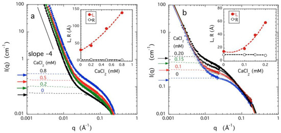 SANS profiles of PAA gels (a) and DNA gels (b) at c = 0.03 g/cm3 swollen in 40 mM NaCl solutions with different concentrations of CaCl2. Continuous lines are fits to Equation (8), dashed lines are the corresponding dynamic components [Ios(q)]. Horizontal arrows at left axis are the values of Ios(0) calculated from Equation (9) using the osmotic data of Figure 2a,b. Insets: dependence of the correlation length L and the cross-sectional radius R on the CaCl2 concentration in 40 mM NaCl concentration.