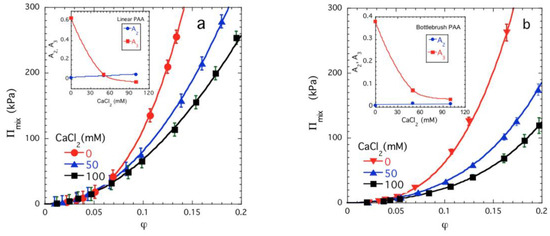 Mixing pressure Πmix versus polymer volume fraction φ plots for linear (a) and bottlebrush (b) PAA solutions in CaCl2 solutions. The continuous lines show fits of Equation (3) to the experimental data and the variation of A2 and A3 as a function of the CaCl2 concentration is shown in the insets. Note that A2 is very small and practically independent of the Ca salt concentration, A3 decreases with added Ca salt, but in the solution of the bottlebrush polymer it does not become negative. Accordingly, the latter solutions are relatively stable against phase separation in the form of a volume transition. The data uncertainties are estimated by one standard deviation of the linear regression fit parameters.