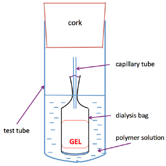 Scheme 2 shows the apparatus designed to perform osmotic swelling pressure measurements. The glass capillary tube in the dialysis bag ensures that the pressure inside the bag is equal to that in the environment. Swelling pressure measurements were made on at least 3 nominally identical gel samples at (25 ± 0.1) °C. Repeated measurements showed a mean change in the osmotic swelling pressure less than 5%.