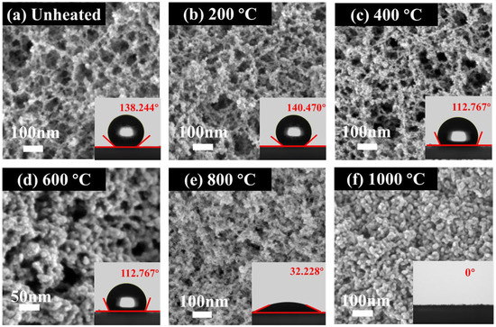 The SEM photos of both virgin and heated samples under over 200 °C, 400 °C, 600 °C, 800 °C, and 1000 °C are shown in Figure 2a–f. The virgin sample had a similar nanostructure with the samples treated under 200 °C to 400 °C, and both of them were highly porous and homogeneous. As the temperature increased, the pyrolysis process of the aerogel sample continued to advance, and the surface groups changed. Most of secondary particles aggregated [25] under 500 °C to 600 °C with the breakdown of the uniform pore structure. For the heat-treated sample under 600 °C, the larger particles had coalesced to form from secondary particles. Finally, as the secondary particles continued to polymerize, larger particle clusters were formed, the three-dimensional network structure was destroyed, and the number of macropores increased sharply for the sample under 1000 °C heat treated. The previously prepared silica aerogels had excellent hydrophobic property, and during surface modification, methyl was attached to the surface which contributes to hydrophobicity of the silica aerogel [19]. As shown in Figure 2a–f, with the pyrolysis of the aerogel samples, its hydrophobic angle rise slightly from 138.244° to 140.470° and then drop sharply, which caused by the increased of the number of methyl groups.
