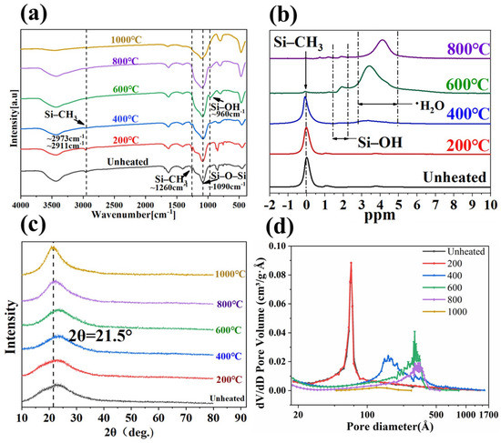 In order to determine the changes in surface groups of silica aerogel samples during pyrolysis, FTIR tests were conducted. As shown in Figure 3a, for silica aerogels after heat treatment at different temperatures, in the spectrum, peak of ~960 cm−1 were observed for the sample heat treated at 400 °C, which was due to the stretching vibration of Si–OH [26] and it disappeared after 800 °C. The peak of ~2973 cm−1, ~2911 cm−1 and ~1260 cm−1 from the stretching, bending and deformation vibration of C–H bonds of Si–CH3 groups, respectively [27,28], gradually became weaker and eventually could not be observed after 800 °C. The changes of peaks indicated that when the silica aerogel was pyrolyzed, Si–CH3 was oxidized and Si–OH was produced. In addition, during the pyrolysis process, as the temperature increased, the peak signal of ~1090 cm−1 continued to increase, which proved that Si–O–Si was continuously generated. The solid nuclear magnetic test also showed similar results. As can be seen from Figure 3b, the untreated and heat-treated under 200 °C and 400 °C silica aerogel had a sharp peak at 0 ppm, indicating the methyl group attached to Si. After heat treatment at 600 °C, the peak at 0 ppm disappeared, and the peak at 2 ppm increased, indicating that during 400 °C to 600 °C, most of the methyl groups attached to Si were oxidized to produce hydroxyl groups. The results of the 1H NMR spectra of silica aerogel was consistent with the previous study [29].