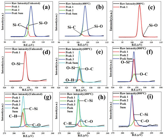 Peak-differentiating and imitating were conducted to further analyze the chemical composition of the samples [31]. As shown in Figure 4a, the Si 2p peak was divided into two peaks assigned to the Si–C and Si–O bond that locate at 101.7 eV and 103.7 eV. Compared with the untreated aerogel, the 101.7 eV (Si–C) signal of the sample heat-treated at 400 °C (Figure 4b) was weakened, while the sample heat-treated at 800 °C (Figure 4c) could only be fitted with the peak located at 103.7 eV (Si–O), which showed the changing process of the methyl group attached to Si. For the element O, as shown in Figure 4d, the spectrum of the original silica aerogel was only fitted with a single peak component O–Si at 532.9 eV, while three peak components could fit to the spectra of silica aerogel heat treatment 600 °C (Figure 4e), 532.9 eV for O–Si, 532.8 eV for O–C, and 532.86 eV for O–H, respectively, which proved that methyl was gradually oxidized to hydroxyl during heat treatment. However, the spectra of the silica aerogel heat treatment at 800 °C (Figure 4f) was fitted by just two peak components, 532.8 eV for O–C and 532.9 eV for O–Si. For the element C, as shown in Figure 4g, the peak of C 1 s could be divided to three peaks at 285.0 eV, 284.2 eV, and 286.2 eV, which could be indexed to C–Si, C–H, and C–O. As the heat treatment temperature rise, the signal of peak at 284.2 eV (C–H) decreases (Figure 4h) while the spectra of the silica aerogel heat treatment at 800 °C (Figure 4i) was fitted by just two peak components, 286.2 eV (C–O) and 285.0 eV (C–Si). The splitting results of O 1 s and C 1 s confirmed the element composition in Table 2. The methyl group was oxidized to hydroxyl even if the silica aerogel underwent high-temperature heat treatment, and the hydroxyl group condensed to form Si–O, but the element C still existed in the form of C–O and C–Si.