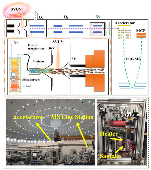 At the combustion beamline (BL03U) of the National Synchrotron Radiation Laboratory in Hefei, China, the synchrotron vacuum ultraviolet photoionization mass spectrometry (SVUV-PIMS) analysis was performed. In this work, aerogel silica samples were heated in the reactor from 20 to 800 °C by 15 °C/min. Nitrogen was used as the carrier gas to provide an inert atmosphere, which can introduce the pyrolytic vapor to the ionization chamber, in which the sampling capillary and synchrotron vacuum ultraviolet (SVUV) light meet at a perpendicular. The pyrolysis products were ionized by the crossed SVUV light, and the generated ions would be analyzed by reflection electron microscope TOF-MS. The test principle is shown in Figure 5. More information on this end station and beamline can refer to the relevant reference [38,39]. In order to verify the analysis of the structural changes caused by the changes in the surface groups of the silica aerogel after heat treatment, models were established by Fluent software to calculate the heat transfer based on the test results of the TEM and BET void structure, and then compared with the experimental data.