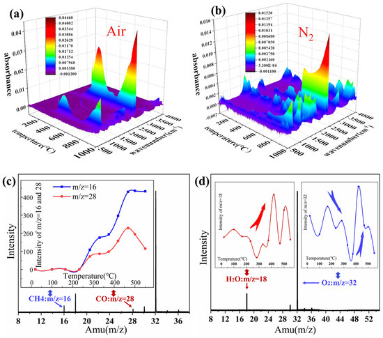 TG-IR spectra of the untreated silica aerogel under (a) air and (b) N2. (c) SVUV-PIMS of background and signal intensity trends of m/z = 18 and 32. (d) SVUV-PIMS at 450 °C and signal intensity trends of m/z = 16 and 28.