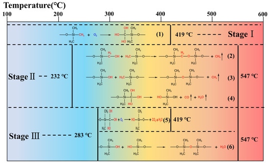 When the hydrophobic silica aerogels were heated in the air, a series of reactions would occur, as the surface and internal reactions would be different [32], and the whole process could be divided in four stages. The possible reactions at various stages of pyrolysis were showed in t following chemical formulas (Equations (1)–(6)) and Figure 7.
