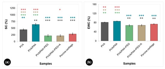 Swelling capacity (a) and equilibrium water content (b) of the hydrogels and porcine cartilage. Error bars are the ± standard deviations, n = 3. Data were analyzed using ANOVA (p < 0.0001) and Tukey’s HSD test. Statistical differences are indicated by asterisks (* p < 0.05, ** p < 0.005, *** p < 0.0005).