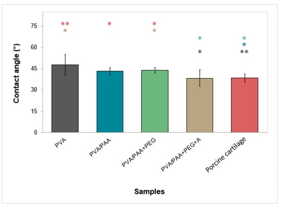 The results of the wettability measurements of the materials’ surfaces are given in Figure 3. All hydrogels were hydrophilic, with water contact angles between 38° and 48°. Annealed samples presented the lowest contact angle, similar to that obtained for the porcine cartilage.