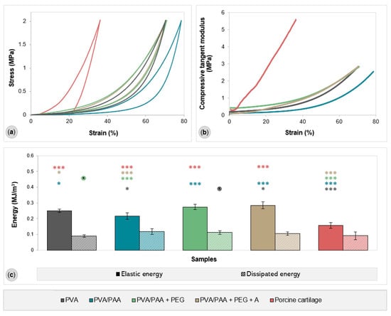 Representative compressive stress–strain curves of all tested materials are provided in Figure 4, together with their compressive tangent modulus for the entire strain range, elastic energy (area of the hysteresis loop), and dissipated energy (total area under the unloading curve). All hydrogels showed a non-linear stress–strain relationship, meaning that all samples, including the porcine cartilage samples, exhibit viscoelastic behavior. The addition of PAA to PVA led to a decrease in the compressive modulus for the entire strain range, with this hydrogel being the most compressible of all (it reached a strain of about 80%). In contrast, porcine cartilage proved to be stiffer and less compressible, with a higher modulus of elasticity and a maximum compressive strain of 36%. PEG-doped and annealed hydrogels presented a compressive behavior similar to PVA. As for elastic energy, porcine cartilage showed the lowest value (0.14 MJ/m³), while the lowest among the hydrogels was found for PVA/PAA (0.22 MJ/m³). No statistically significant differences were observed for the dissipated energy, except between PVA and PVA/PAA+PEG.