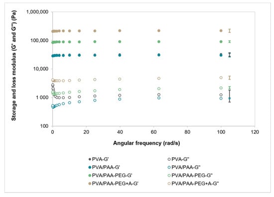 The angular frequency curves obtained for the different hydrogels are shown in Figure 5. In all cases, G’ was more than one order of magnitude higher than G’’ throughout the whole frequency range. PVA and PVA/PAA showed the lowest G’ and G’’ values. The addition of PEG resulted in an increase of the elastic contribution (G’), which was even more significant after annealing. A similar tendency was found for G’’, but at a much lower scale.
