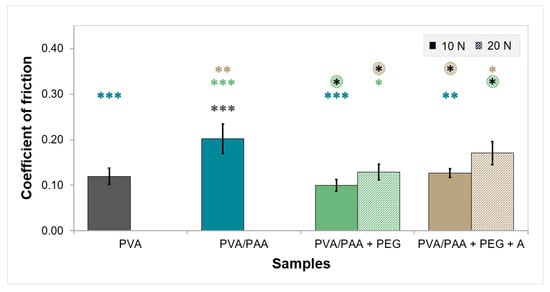Friction coefficients of the samples tested against SS 316L in PBS solution under a load of 10 or 20 N. Error bars are the ± standard deviations, n = 3. Pairwise comparisons involving at least one group assayed at 20 N were done using the independent samples t-test. All other comparations were performed using ANOVA (p < 0.0005) and Tukey’s HSD test and refer to comparisons with results obtained with load 10 N and 20 N, respectively. Statistical differences are indicated by asterisks (* p < 0.05, ** p < 0.005, *** p < 0.0005).