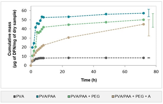 Cumulative drug release profiles from samples loaded with DFN. Error bars are the ± standard deviations, n = 4.