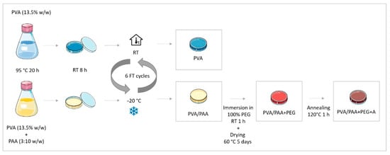 Some PVA/PAA hydrogels were wholly immersed at room temperature in 100% PEG for 1 h. Then, they were removed from the liquid medium, blotted with absorbent paper, and dried at 60 °C for about 5 days until the weight became constant to obtain PVA/PAA+PEG hydrogels. Some of these were further subjected to an annealing (A) treatment at 120 °C for 1 h, giving rise to PVA/PAA+PEG+A hydrogels. The methodology followed for the materials’ preparation is summarized in the schematic diagram shown in Figure 9.