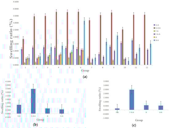 SRs of the A and A-A hydrogels are between 0–1.0, whereas those of the G-A hydrogels are between 1.0–1.5, those of the G-A-A are between 3.0–3.5, those of the F-A are between 0–0.5 and those of the F-A-A are between 2.0–2.5.