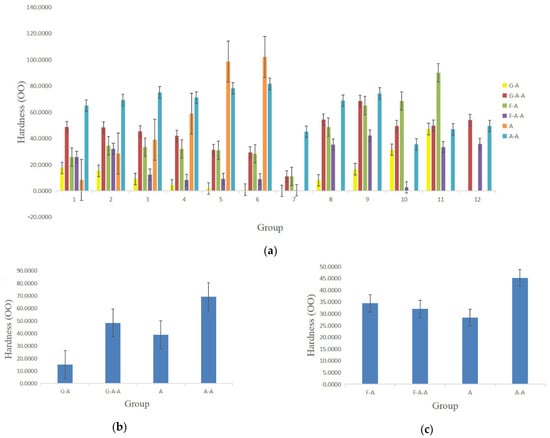 Figure 6a). The influence of gelatin on the hardness is obviously higher than that of fibrinogen. Meanwhile, the hardness of the hydrogels increases with the increase in the alginate and agarose concentrations. The hardness of the G-A hydrogel with the optimal concentration, as shown in
