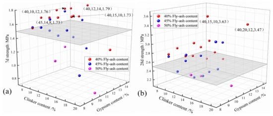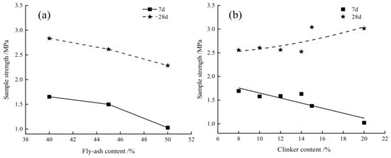Composite cementitious material filling body strength test result: (a) 7 d, (b) 28 d.