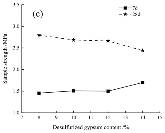 The relationship between the amount of each cementitious material component and the filling body strength: (a) fly ash, (b) clinker, (c) desulfurized gypsum.