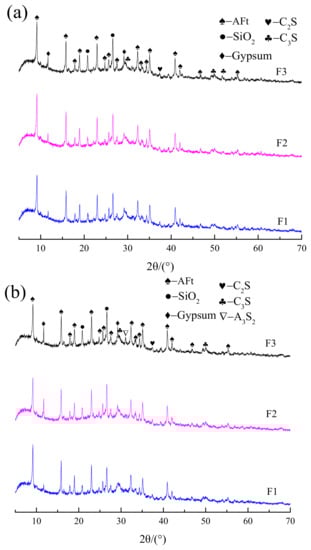 XRD spectra of F1, F2, and F3 groups at 7 d and 28 d: (a) 7 d, (b) 28 d.