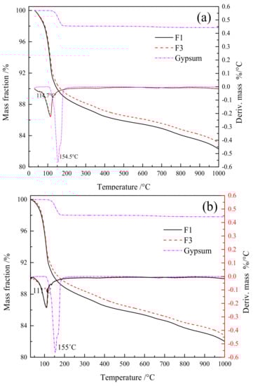 Figure 4 depicts the 7-d and 28-d TG/DTG diagrams for the F1 and F3 groups, and desulfurized gypsum. Among them, the heating range during the test is 30~1000 °C, and the mass loss is converted according to the content. Figure 5 shows that the TG/DTG curves of the F1 and F3 groups at different ages all had a rather obvious peak near 110 °C. The heat loss in this interval was caused primarily by the dehydration reaction of such products as hydrated calcium aluminosilicate gel and ettringite (AFT). Meanwhile, the dehydration of gypsum occurred at around 154 °C. There was little mass loss in other temperature ranges, suggesting that the major hydration products of fly ash cementitious material were the gel and AFt.