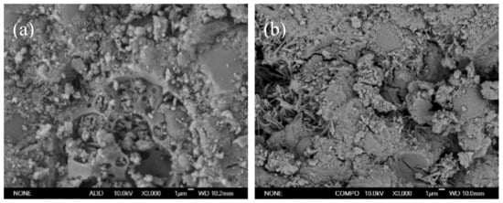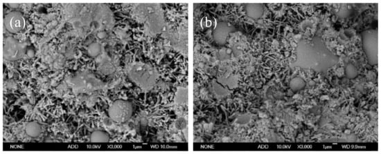 Figure 5 and Figure 6 display the SEM micrographs of the fly ash cementitious materials for the F1 and F3 groups. As is clear, substantial rod-shaped AFt and amorphous clustered C–S–H gel could be observed in the 7 d and 28 d hydration products of the two cementitious materials. From the 7 d SEM micrograph, some spherical particles were also observable, which were unhydrated fly ash. The 7 d SEM micrographs differed insignificantly between the two types of materials, indicating the presence of slow hydration and low strength problems with them in the early stage. However, after 28 d, a relatively dense cement microstructure had been formed in the F1 group, while the set cement in the F3 group was not quite dense, with the appearance of some pores and gypsum. Moreover, some unhydrated spherical fly ash was found, which explained the reason for the higher strength of test filler blocks in the F1 group from a microscopic perspective.