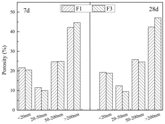 The pore structures of the fly ash cementitious filler blocks for the F1 and F3 groups were analyzed by MIP. Table 2 and Figure 7 present the characteristic pore structure parameters of the two types of materials. The correlation between cumulative mercury intrusion volume and pore size is described in Figure 8, whereas the correlation between differential mercury intrusion volume and pore size is illustrated in Figure 9. As is clear, the predominant pores of the two cementitious materials were sorted as: severely harmful pores > harmful pores > harmless pores > slightly harmful pores. At the 7-d and 28-d ages, the porosities of the F1 group were all smaller than those of the F3 group. Nonetheless, the porosities in both groups increased with growing age, which was attributed to the use of expansive AFt as the hydration product. With growing age, the number of harmful pores in the F3 group increased significantly, which was associated with the damage of the full tailings aggregate skeleton by the excessive addition of fly ash. As displayed in Figure 8, the cumulative mercury intrusion volumes in the F3 group were all higher than those in the F1 group at the 7-d and 28-d ages, indicating larger porosities in the F3 group than in the F1 group at both ages. The pore corresponding to the peak on the curve in Figure 10 was the most probable pore, i.e., the pore with the greatest probability of occurrence. It is clear from Figure 8 that the most probable pore size at 28 d was 0.36 μm for the F1 group, while reaching 0.68 μm for the F3 group, with a difference of nearly 2 times. This suggests that the excessive content of fly ash leads to enlarged cement pores and loosened aggregate skeleton, thereby resulting in the decreased strength of the filler cements.